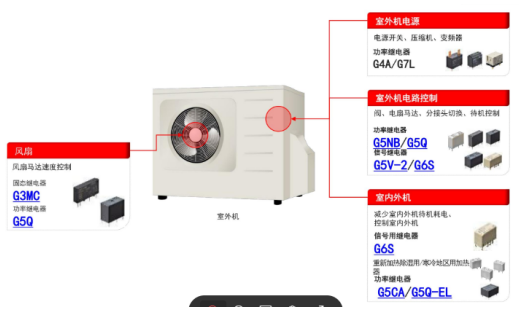 欧姆龙G3MC固态继电器和G5Q功率继电器在空调外机的中的应用主要用于风扇马达速度控制。