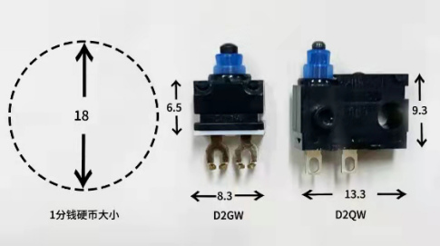 一分钱的硬币直径18mm,边厚1.25mm,而D2GW开关外形尺寸W8.3mm×D5.3mm×H6.5mm,可以说是目前市面上体积非常小的开关了。