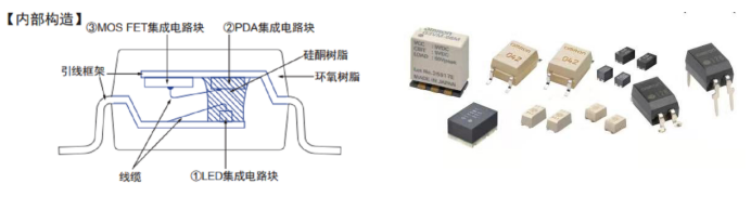 具有超小型,高寿命,低驱动电流,低导通电阻的特点;由3个集成电路块构成:①LED集成电路块(发光二极管);②PDA集成电路块(发光二极管阵列);③MOS FET集成电路块,多种端子类型,可负载电压20V~600V