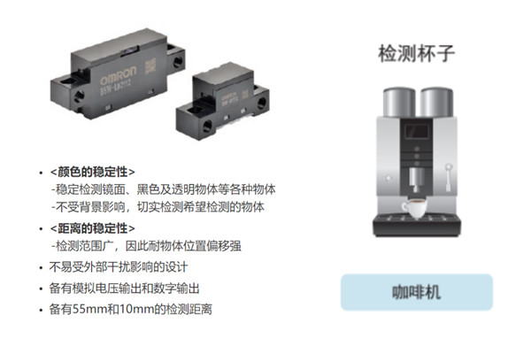 欧姆龙限定反射型传感器B5W应用在咖啡机中,这个系列的传感器具有哪些特点呢,如下: