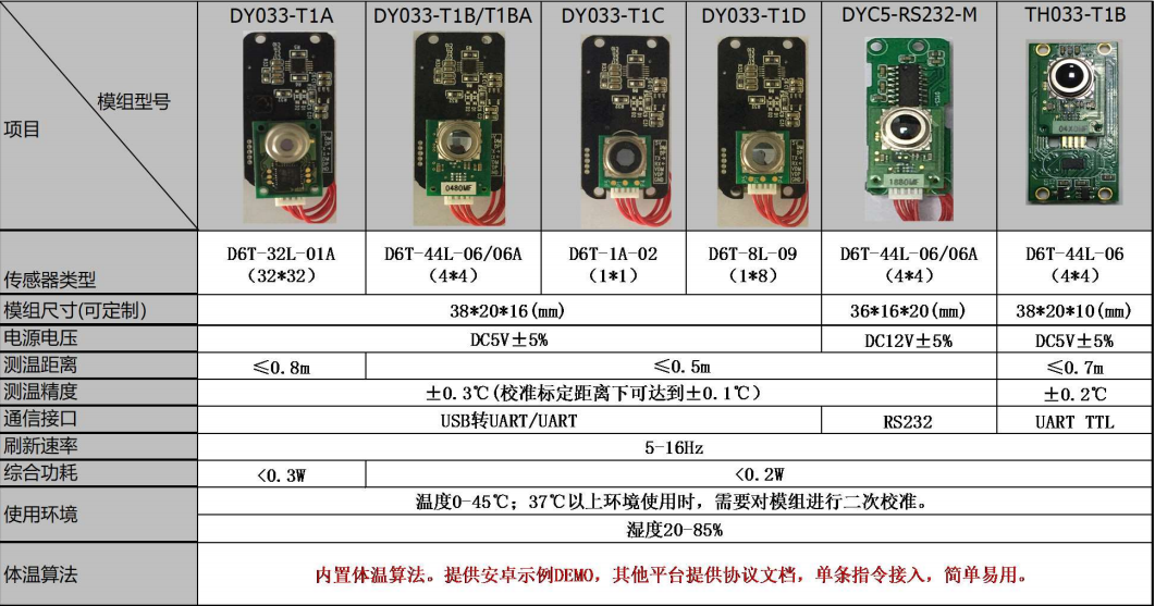 我们同时也可以给您提供一整套的测温解决方案!我们可以根据客户测温需求,搭载1*1,1*8, 4*4,32*32欧姆龙测温传感器,实现检测距离0.3-0.8米测温,测温精度可以达到±0.3℃(校准标定距离下可达到±0.1℃)。也可以满足客户的多种串口通讯方式(1)USB转UART/UART;(2) RS232 ;(3) UART TTL。模块资料如下: