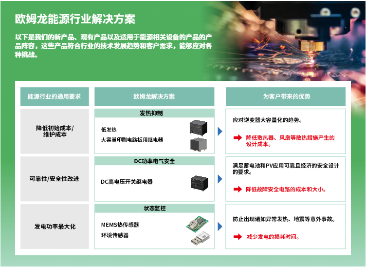 在能源行业新产品,除上期介绍的G9KA、G7EB、G9KB、G7L-X、G2RG-X、G5PZ-X等6个系列功率继电器,还有以下产品方案: