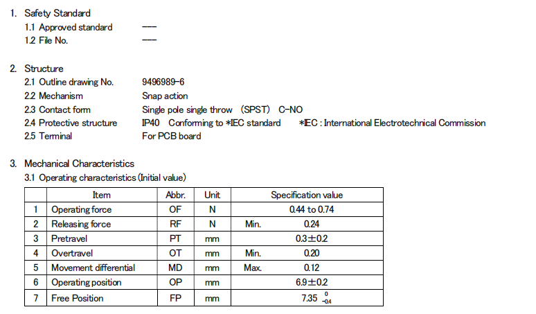 D2FC-F-7N(10M), 克力为:60+/-15G,寿命为1000万次;