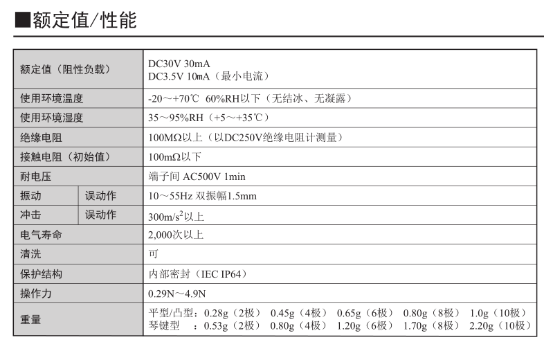 相当于密封构造IP64(IEC-60529)防止焊剂浸入,即使在尘埃较多或有水的地方使用也 能确保高接触可靠性。