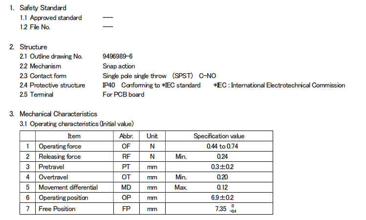 D2FC-7-H 克力为:90+/-15G,寿命为500万次;